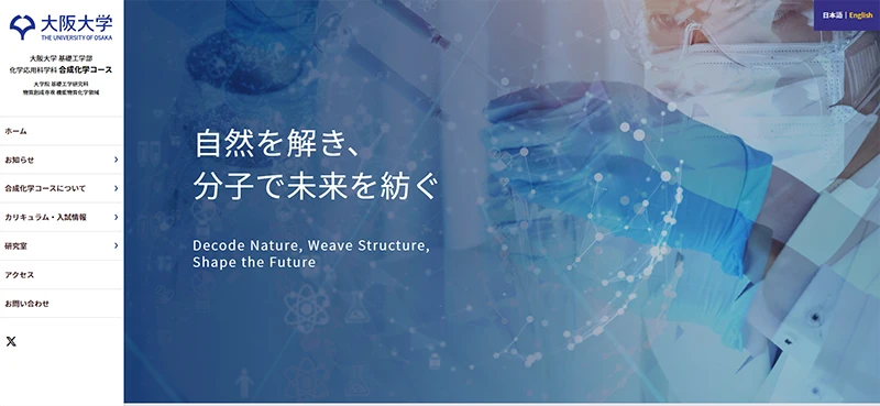 大阪大学 合成化学コース様ホームページのディレクション・マルチデバイス対応(PC、タブレット、スマートフォンレスポンシブ)デザイン制作、CMS設置・設定、動画編集、サーバー・データ移行。
